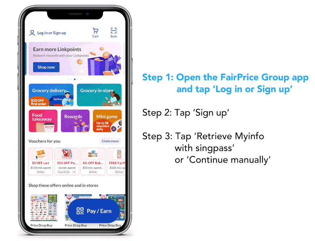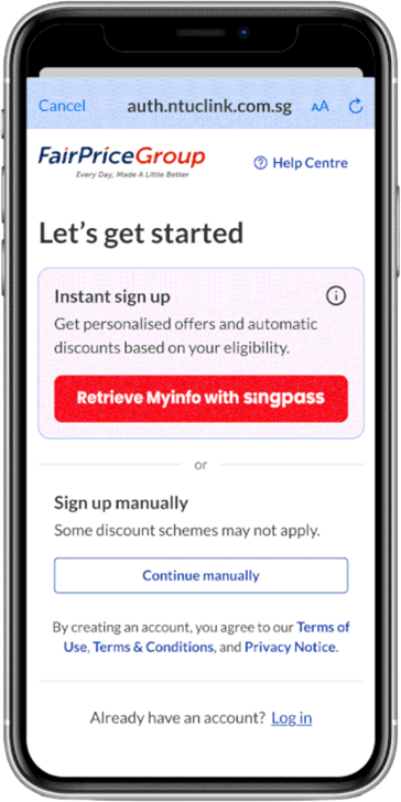 Open the FairPrice Group app and tap ‘Log in or Sign up’