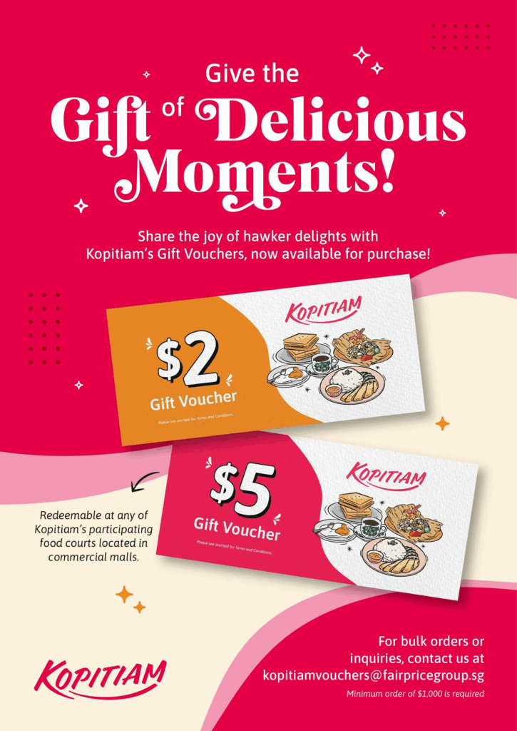 Kopitiam Gift Vouchers come in denominations of $2 and $5.